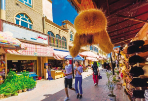 阿熱亞民俗文化街有多個(gè)巴扎,分別是首飾巴扎、花盆巴扎、坎土曼巴扎、木器巴扎、維藥巴扎、帽子巴扎。路上隨處可見(jiàn)妝扮時(shí)尚的當(dāng)?shù)厍嗄?,女孩子們穿著破洞九分牛仔褲?/span>