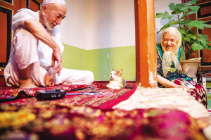 20多年前的喀什古城,老舊巷道縱橫交織,衛(wèi)生狀況較差,一些大膽的老鼠不論白天黑夜在巷道里亂竄,很多人家養(yǎng)貓是為了對(duì)付老鼠。如今走在改建后的古城里,所到之處窗明幾凈,而這里的貓從捕鼠者變?yōu)榧彝櫸?。貓已適應(yīng)角色轉(zhuǎn)變,愜意地享受著暖暖的羊毛毯。老兩口對(duì)寵物貓像對(duì)自家的孩子一樣呵護(hù)備至。