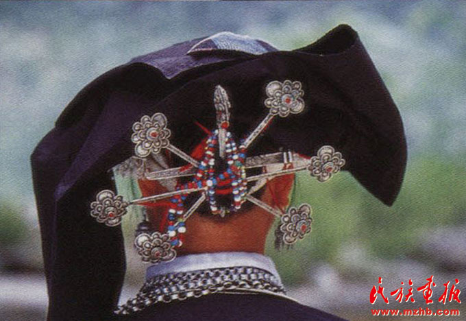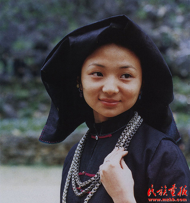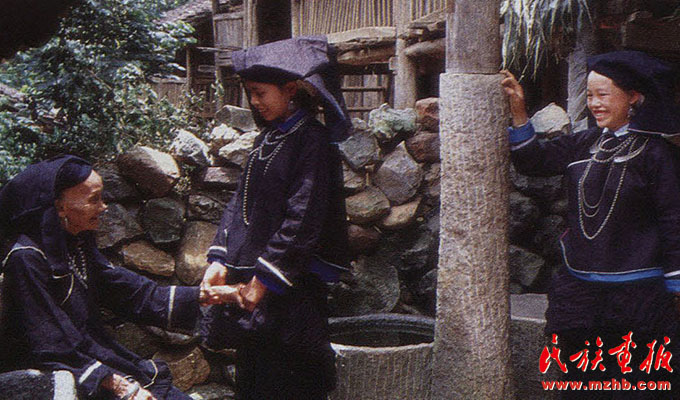 婦女的服飾更具特點,無論老少,都喜歡穿右蓋大襟和葫蘆狀矮腳圓領的緊身短式上衣,下身以寬褲腳、大褲頭的褲子相搭配,腰系黑布做成的大圍裙,頭帶黑布大頭巾。其圍裙既寬且長,戴時能系周身有余,裙底垂掛到小腿下部,圍裙不僅作為裝飾,而且可以作為勞動工具,遇趕圩或走親訪友和勞動時,可將圍裙底翻卷上來作成小包袱,用以包裝和盛裝物品。婦女頭巾都是一塊自己紡織染成的長條黑布,戴時先圍繞在頭上,然后翻折擺布成火棱形的圖樣,罩在整個頭上,再把頭巾的兩端分別垂掛到雙肩上,看上去樸素美觀。同時還可以當做帽子遮蔭用。她們的衣邊、衣角、袖口、裙邊和頭巾的四邊都用紅布或黃布剪成小條以后鑲捆上去,有的則用紅、黃、藍色絲線繡成波浪形的線條,使黑中襯出紅、黃、藍色的線條來,清雅明亮,色彩協(xié)調(diào)。再加上頭發(fā)插著龍頭形的銀簪,頸項上帶有銀鏈或項圈,手帶銀圈、玉鐲,耳掛珍珠耳環(huán)等,使人一看,黑中閃艷,樸素之中亦有玲瓏之美,表現(xiàn)了她們獨特的審美觀。