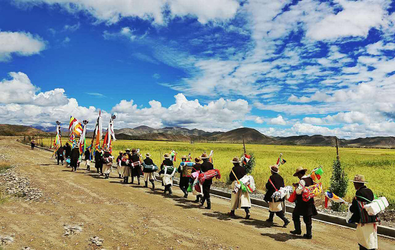 節(jié)日的第一天早晨,當陽光撒滿金黃麥田的時候,農(nóng)民們手持麥穗圍著農(nóng)田轉圈游行,最前邊是由喇嘛和老年農(nóng)民組成的儀仗隊,高舉佛像,背著經(jīng)書,吹著佛號,感謝上天給人們帶來了風調(diào)雨順的好年成。轉完麥田以后,照例要在廣場上舉行群眾性文娛體育活動,其中有藏戲、歌舞、跑馬、射箭、拔河等,十分熱鬧。這天,家家戶戶都要準備充足的酒食,穿上最漂亮的衣服,或者在廣場四周的草場上野餐,或者在村子里邀集親朋好友宴飲。青年男女則喜歡在晚上圍著篝火跳舞,對唱情歌,直到深夜。