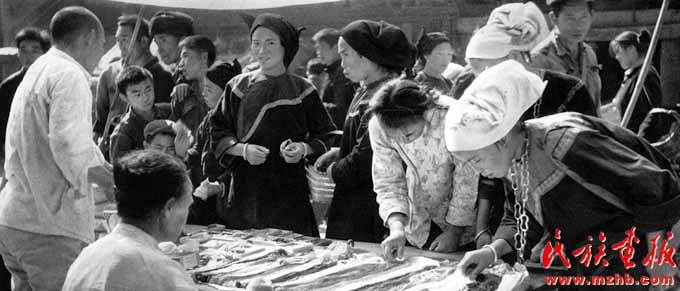 1980年,全國民族地區(qū)落實黨的民族政策,切實尊重少數(shù)民族的傳統(tǒng)習(xí)慣,轟轟烈烈地恢復(fù)民族傳統(tǒng)集市,以最短的時間恢復(fù)生產(chǎn)、發(fā)展自由貿(mào)易、豐富群眾生活。圖為貴州苗族農(nóng)村市場開始活躍起來《民族畫報》1982年第1期