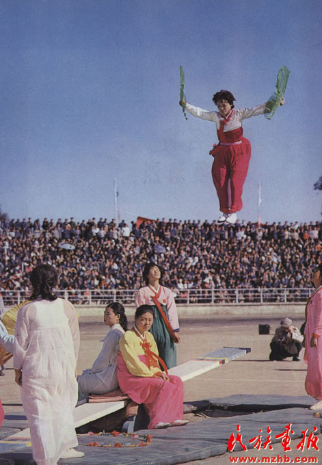 1982年9月2日至8日,第二屆全國少數(shù)民族傳統(tǒng)體育運動會在內(nèi)蒙古呼和浩特舉行,圖為朝鮮族婦女展示傳統(tǒng)游戲項目——跳板。全國少數(shù)民族傳統(tǒng)體育運動會發(fā)掘了一大批新項目,并在探索普及與提高結(jié)合、群眾性與專業(yè)化結(jié)合、傳統(tǒng)體育與現(xiàn)代體育結(jié)合、民族性與世界性結(jié)合的道路上取得了可喜的進步,使少數(shù)民族傳統(tǒng)體育走上了普及、提高、規(guī)范、科學(xué)的道路。目前全國少數(shù)民族傳統(tǒng)體育運動會已經(jīng)舉辦了十屆《民族畫報》1982年第12期