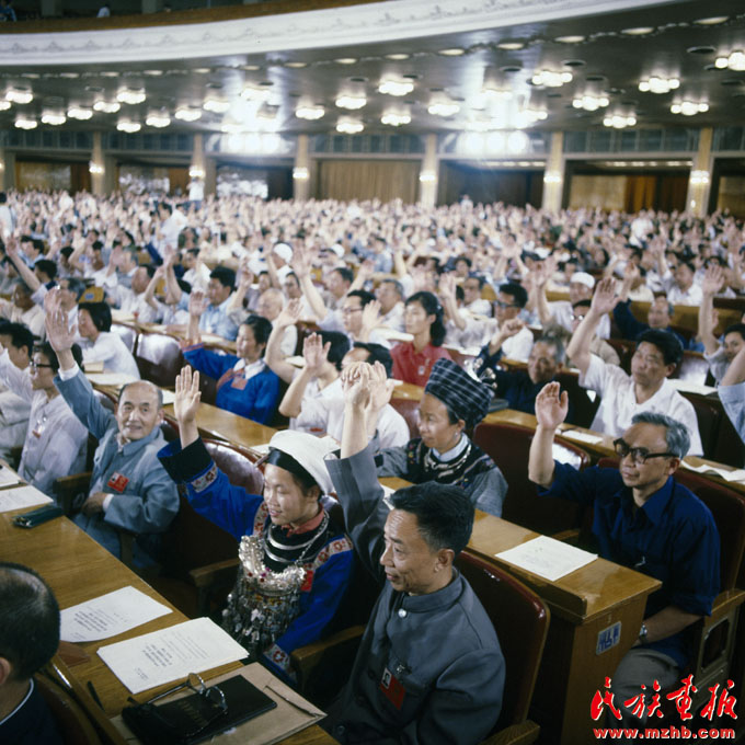 1984年5月31日,中華人民共和國第六屆全國人民代表大會第二次會議通過了《中華人民共和國民族區(qū)域自治法》,自1984年10月1日起施行。民族區(qū)域自治制度是我國的一項基本政治制度。圖為各族代表舉手表決通過《中華人民共和國民族區(qū)域自治法》《民族畫報》2009年慶祝中華人民共和國成立60周年專刊