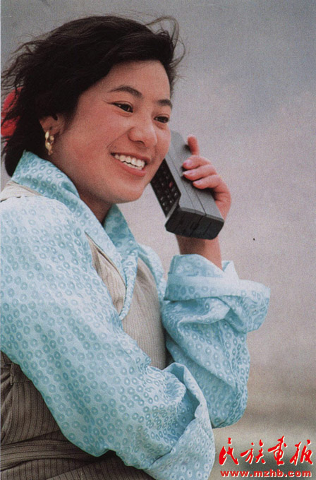 1995年,一位藏族婦女使用移動電話聯(lián)系業(yè)務(wù)。這一年除青海省外,全國各省區(qū)都開通了移動電話業(yè)務(wù),極大地方便了群眾的聯(lián)絡(luò)與溝通?!睹褡瀹媹蟆?008年第12期