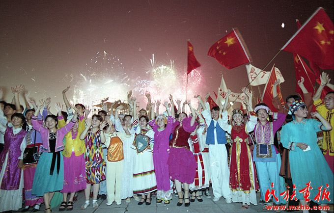 1997年7月1日零點,中華人民共和國國旗和香港特別行政區(qū)區(qū)旗在香港升起,經(jīng)歷了百年滄桑的香港回到祖國的懷抱,中國政府開始對香港恢復(fù)行使主權(quán)。香港回歸祖國,舉國上下一片歡騰。各族人民以隆重而熱烈的方式,歡呼五星紅旗在香港特別行政區(qū)高高飄揚。圖為首都各民族學(xué)生熱烈慶祝香港回歸?!睹褡瀹媹蟆?997年第9期