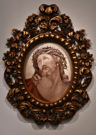 本作品展現(xiàn)的是耶穌被釘在十字架上遭受殘酷折磨的神態(tài)。作者用亂針繡和平繡相結(jié)合的方法,用細(xì)密的排針將耶穌的苦難放大在觀者面前。整個(gè)繡面呈現(xiàn)出了靜默而肅穆的氛圍。