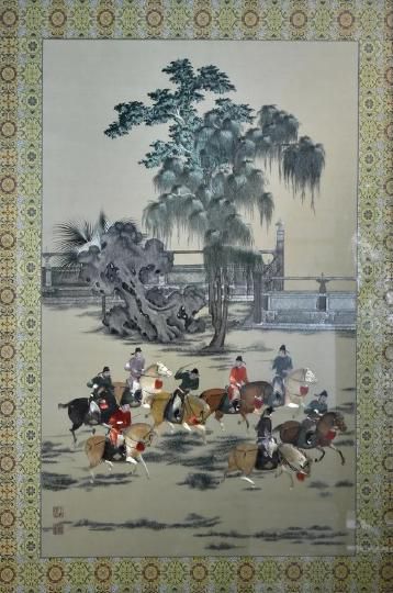 取材于后梁畫家趙喦所作《八達(dá)游春圖》。八人策馬揚(yáng)鞭于草地間,前者呼,后者應(yīng)。絲縷排列精致細(xì)膩,人物五官不逾寸豆,卻被精巧的一一繡出,神情各異,極為傳神。