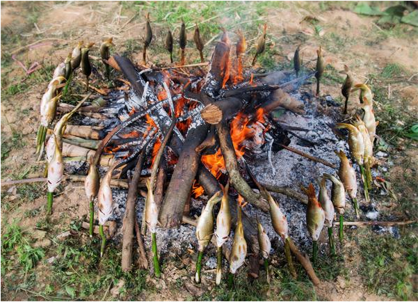 說起燒魚,得從古代人類祖先燒肉燒魚談起。苗族先輩們在長期的遷徙跋涉中,或到西南方向的崇山峻嶺定居后,都要到山下水塘、溪流中捕捉蛙魚來充饑,維持生活。由于沒有鍋頭和碗具,只能燃燒篝火紅炭來燒烤蛙、魚至熟,然后上山采摘蕉葉、芒草來墊盛,大家圍攏在一起一同享用,久而久之便形成了野炊燒魚的習(xí)慣,一直流傳至今。