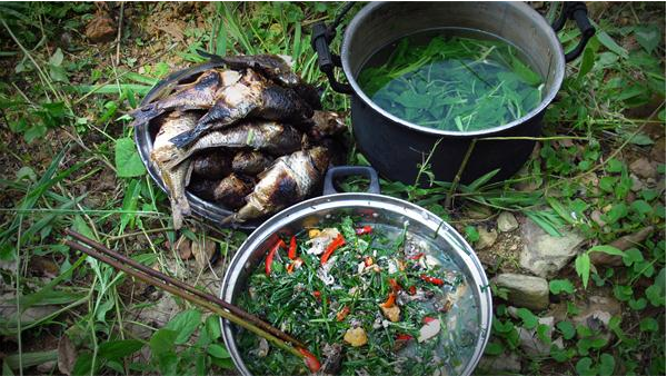打魚湯也獨具特點,先用缽頭盛好冷水,放入佐料和魚仔,再把洗凈的鵝卵石放進(jìn)火炭中燒的通紅,然后放進(jìn)缽里,反復(fù)多次,直至把魚湯燒開,魚仔和佐料燒熟,味道特別新鮮可口。