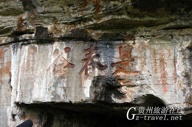 “是春谷”摩崖長(zhǎng)20米,高3米,約2萬(wàn)余字,名為《洗心泉集》,從經(jīng)史集成的詩(shī)章共46首,670佘行。所集之書(shū)包括易、書(shū)、詩(shī)、春秋、三禮、四書(shū)、孝經(jīng)、爾雅、楚辭、漢、魏、晉、劉宋、南齊、北、周、隋、唐、五代、宋、金、遼、元、明以及時(shí)賢黔宦,黔人等各時(shí)代著名書(shū)籍。每字約4,5厘米見(jiàn)方,歐體楷書(shū)工整秀麗,為貴州摩崖上乘之作。“白苧春流環(huán)谷水,青山高詠屬宣城?!庇紊酵嫠g,詠此詩(shī)句,別有韻味。
