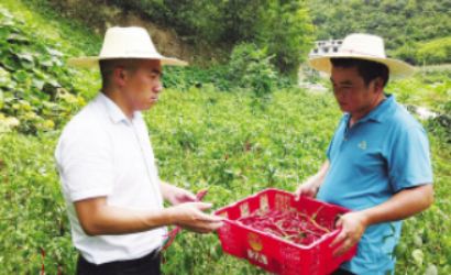 石通佾(左)與場(chǎng)河村村民石佩發(fā)(右)交流辣椒收成情況。馬永攝
