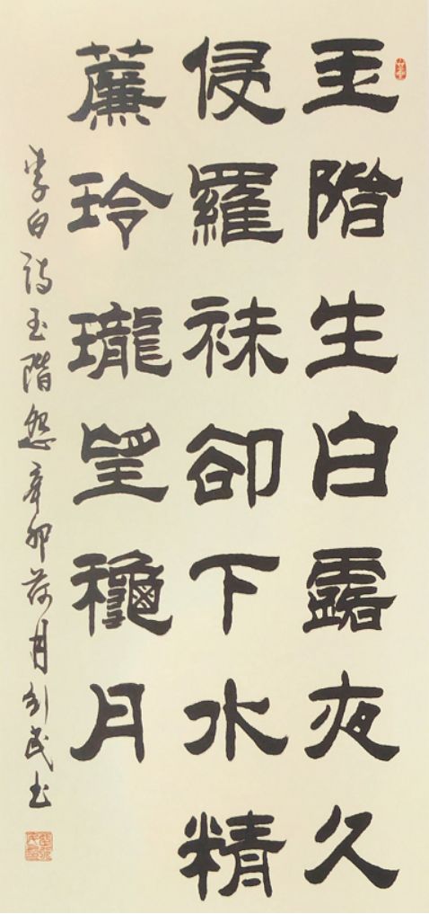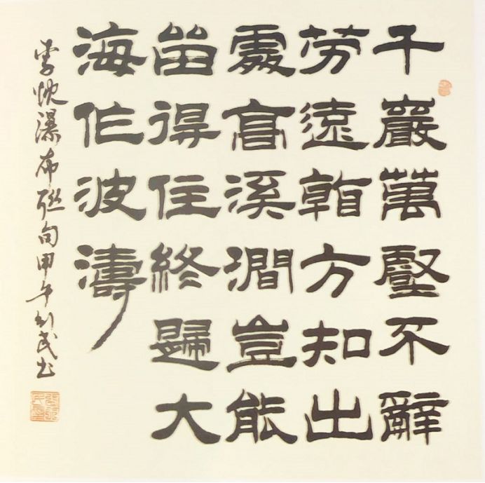 張行民的書法作品博覽眾家之長,悉心揣摩隸書之要義,領(lǐng)悟其精髓,加入其心志與感悟,漸漸形成了自己的風(fēng)格。他的作品灑脫飄逸,體骨厚重,參合有各派書體的筆意,同時又有自己個性和意境的張揚(yáng),字體端莊英武,體象收放凝度。賞其書法,總能給我們一種“渾然陣列,筋道玉骨”的美感,實(shí)屬不可多得。