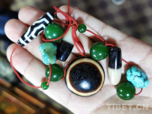 商家們一般把天珠分為幾類。第一類是印度的天珠,經(jīng)營這類天珠的商家很少,這些珠子也主要是賣給游客,要價(jià)一般每顆在150-300元之間。第二類是臺灣天珠,經(jīng)營者較多,多數(shù)商家將其看作普通飾品,目標(biāo)群體也主要是游客,每顆的價(jià)格在50-800元之間。第三類,也就是在那里大家常說的“真天珠”或“老天珠”,價(jià)格每顆一般從幾千元起,至幾十萬元不等。當(dāng)然,在第三類中,除了天地珠、虎牙珠等花紋形式外,天珠上“眼睛”的數(shù)量也很重要,一般地,好天珠上的眼睛越多,價(jià)格最高。在當(dāng)?shù)厣碳液娃r(nóng)牧民看來,一顆上好的九眼天珠真的是價(jià)值連城。
