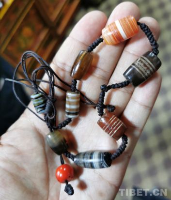 在藏語中,天珠被稱為“瑟”。在普蘭邊貿(mào)市場中,并不是所有的商家都有天珠。但凡是有上好天珠的商家,必有很大的吸引力。在市場中,他們也充滿自信。我在市場中走訪了多家有天珠的商店,并簡要總結(jié)了多數(shù)商家對天珠的認(rèn)定標(biāo)準(zhǔn)。在尼泊爾商家的眼中,天珠的質(zhì)量要看幾個方面。一是“石頭”的質(zhì)量,上好的“石質(zhì)”是好天珠的必要條件。他們在檢驗(yàn)時(shí),多用門牙上下撞擊天珠的不同位置,便可以分辨出天珠料子的好壞。在那里,我也遇到了幾位買天珠的僧人,其辨別過程中也使用了這樣的方法。二是包漿程度,一顆好天珠就要有相應(yīng)的歲月的痕跡,而包漿就是歲月長短的最重要的代表。當(dāng)然,這也并非絕對,因?yàn)榘鼭{的形成主要依靠人為的把玩,那些沒有相應(yīng)包漿但達(dá)到上千年的天珠在他們眼中依然很快便會被識別出。在尼泊爾的茶館中,一位當(dāng)?shù)氐牟刈迦罕娤蛭医榻B了一顆天珠,據(jù)說有人曾用成都的一套房子來換,但并未打動主人,那顆珠子擺在我的面前,沒有所謂的包漿,但歲月形成的厚重感卻十分明顯。三是天珠的孔道,因?yàn)榭椎酪彩菤q月的見證者,一般孔道越是圓潤便越具有價(jià)值。