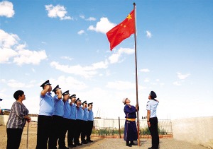 阿迪雅(右二)、妻子娜仁其其格(左一)與內(nèi)蒙古出入境邊防檢查總站包頭邊境管理支隊滿都拉邊境派出所民警在院子里升起國旗。 馮楚帆攝