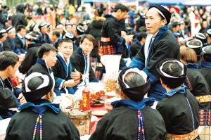 每逢重要節(jié)日,白褲瑤群眾都有舉辦長席宴的習(xí)俗。以前,芭蕉葉當作盤子,芭芒干折成筷子,一個飯團、一塊牛肉,再加一碗酒,就是長席宴的全部?,F(xiàn)在改變了很多,但不變的是白褲瑤自然、和諧、平等的美德。2019年2月拍攝。