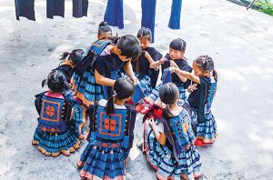 南丹縣瑤族服飾代表性傳承人黎鳳珍在染坊免費教授前來學(xué)習(xí)的小學(xué)生。2018年拍攝。
