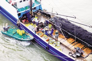 小快船靠上捕魚歸來(lái)的大漁船,收購(gòu)、轉(zhuǎn)運(yùn)海鮮漁獲(2014年攝)。
