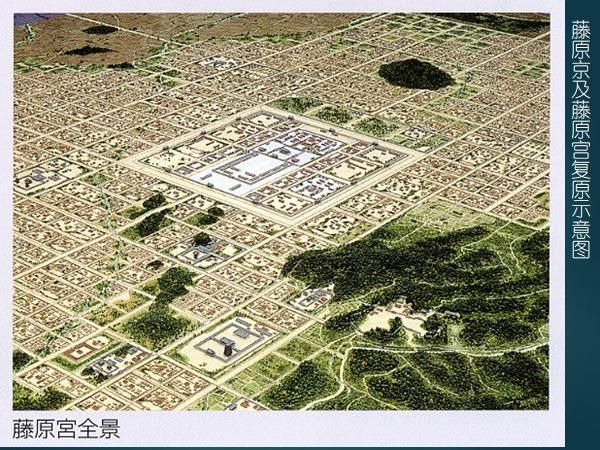 飛鳥-奈良時代對作為中央集權國家的象征的都城建設,極其重視。藤原京是持統(tǒng)、元明、元正三代天皇延用了16年的都城遺址,這個遺址經過幾十年的考古發(fā)掘,已經探明了藤原京和藤原宮的范圍及布局(圖二十)。京城東西及南北各長5.3km,平面近正方形,宮城在其中央,這點與唐長安城不同。有學者認為,藤原京是以《周禮》規(guī)定的理想化都城建制為依據所筑成的。