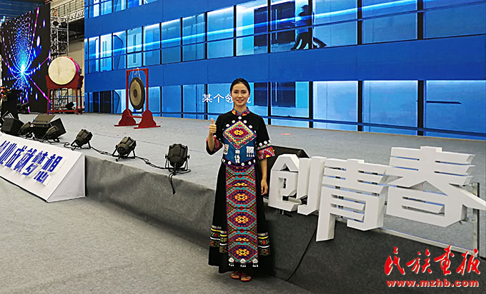 鐘億靈在“創(chuàng)青春”中國青年創(chuàng)新創(chuàng)業(yè)大賽中為嘉賓做項(xiàng)目講解。
