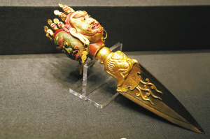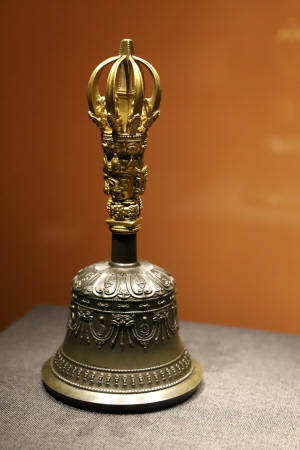 持驗(yàn)法器單元主要展示修持佛法、舉行佛事活動(dòng)和佛教儀式時(shí)所用的法器,包括金剛鈴、金剛杵、嘎巴拉碗、嘎巴拉鼓、嘎巴拉念珠、喀章嘎、金剛橛、鉞刀等。本部分所選法器多為藏傳佛教密宗修行所用,因多存于庫(kù)房,已不在原佛堂陳設(shè),其用途和使用場(chǎng)所便難以知悉。故宮中有許多佛堂,大多是乾隆時(shí)期建造,其中很多是密宗佛堂,如雨花閣、梵華樓、梵宗樓、養(yǎng)心殿西暖閣佛堂等。