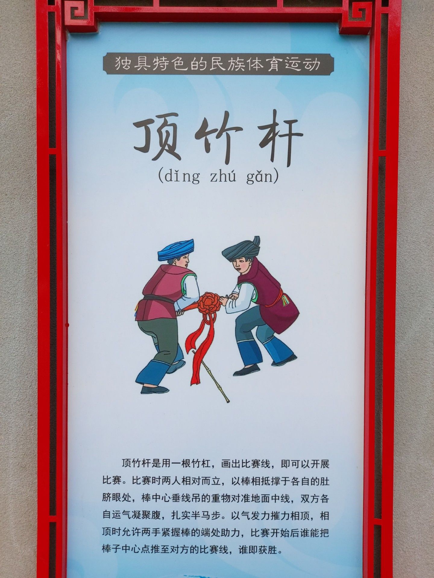 頂竹桿是用一根竹杠,畫(huà)出比賽線,即可以開(kāi)展比賽。比賽時(shí)兩人相對(duì)而立,以棒相抵撐于各自的肚臍眼處,棒中心垂線吊的重物對(duì)準(zhǔn)地面中線,雙方各自運(yùn)氣凝聚腹,扎實(shí)半馬步。以氣發(fā)力摧力相頂,相頂時(shí)允許兩手緊握棒的端處助力,比賽開(kāi)始后誰(shuí)能把棒子中心點(diǎn)推至對(duì)方的比賽線,誰(shuí)即獲勝。