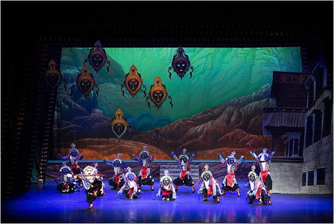 在手段創(chuàng)新上,主創(chuàng)人員在嚴(yán)格遵循南木特藏戲藝術(shù)傳統(tǒng)和戲劇原則的基礎(chǔ)上,設(shè)計了部分新的唱腔,使用了現(xiàn)代舞臺的舞美和聲光電手段,采用了26人組成的中型民族樂隊,從而營造出了全新的舞臺效果。在藝術(shù)手法上,還采用了以南木特藏戲手段表現(xiàn)西藏藏戲內(nèi)容的特殊表現(xiàn)形式,以戲中戲的重疊盡顯不同風(fēng)格的藏戲風(fēng)采,大大地豐富了表演手段和出彩看點,為觀眾提供了巨大的想象空間。