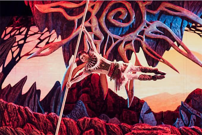 雜技藝術(shù)在劇場空間維度的呈現(xiàn),一是把身體作為一種最為本質(zhì)的符號材料進行直接表現(xiàn);二是通過與物體、音樂、舞蹈、燈光、唱詩等的排列組合,展示技藝的身體與物體、空間的關(guān)系,達到彰顯其生命意蘊與美學(xué)品質(zhì)的目的。劇中網(wǎng)吊、綢吊、轉(zhuǎn)動桿上技巧等項目非常炫技,展現(xiàn)了現(xiàn)代雜技的審美意境,詩與思在舞臺上相得益彰。綢吊極具浪漫色彩,承載著輪回與終極的生命哲理;智者的“唱詩”,凸顯了該劇的史詩特征,增加地域文化和遠古歷史的厚重感。