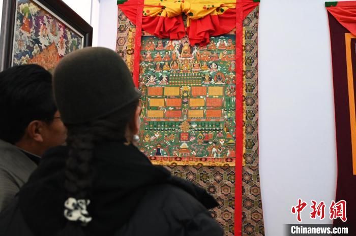 圖為唐卡愛好者欣賞唐卡展品?!≮w朗 攝