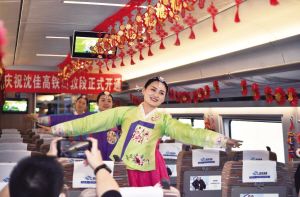 沈佳高鐵長(zhǎng)白山至敦化段開通運(yùn)營(yíng),將促進(jìn)沿線旅游業(yè)和冰雪經(jīng)濟(jì)快速發(fā)展,進(jìn)一步加強(qiáng)民族團(tuán)結(jié),助力長(zhǎng)吉圖開發(fā)開放、深度融入 “一帶一路”。圖為列車工作人員在車內(nèi)表演朝鮮族歌舞。 新華社發(fā)