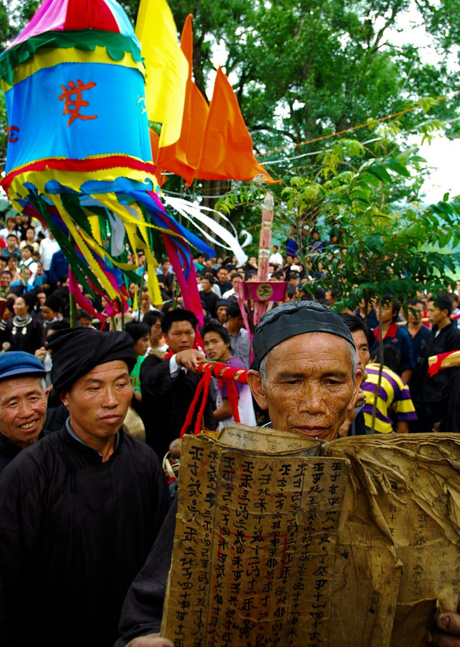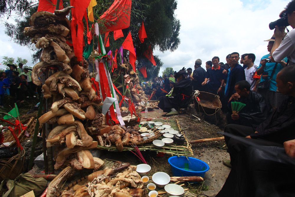 人們傳說只有醉倒了"霞神",它才能永遠(yuǎn)留在這方,才能使這里風(fēng)調(diào)雨順。當(dāng)水書先生念了最后的咒詞,祭典才在鼓樂聲和歡呼聲中結(jié)束。最后,各族系將祭肉一并聚攏,聚餐慶祝。天黑之后,人們秘密地將"霞神"收藏起來,至此,"敬霞"活動(dòng)全部結(jié)束。
