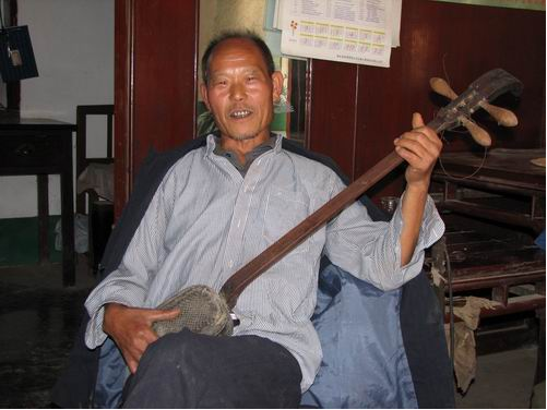 五峰南曲無專業(yè)藝人,“門第師”家傳者居多。師徒間手藝南曲兼學(xué),親朋相教亦不少。其演唱形式以坐唱為主,一人自彈自唱,或二人一彈一唱,亦可多人一起彈唱。自制小三弦是其主要伴奏樂器,也有配以二胡、簡板的,并不拘于一格。