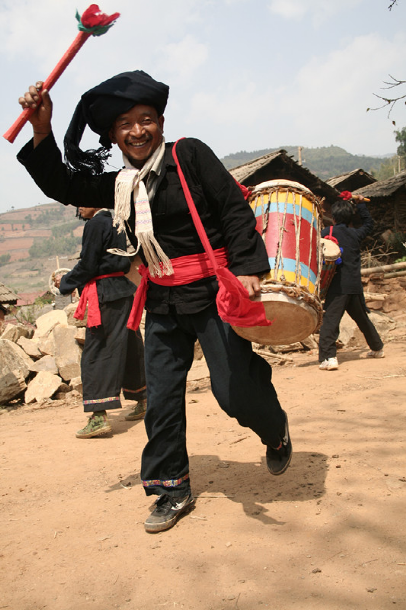 現(xiàn)今的蜂桶鼓直徑一般25—30厘米,高70—80厘米,以攀枝花樹(shù)或柳樹(shù)挖空樹(shù)心,兩端蒙上牛皮制成,形似蜂桶。鼓棒直徑3—4厘米,長(zhǎng)40—50厘米,兩端系有彩色布條。