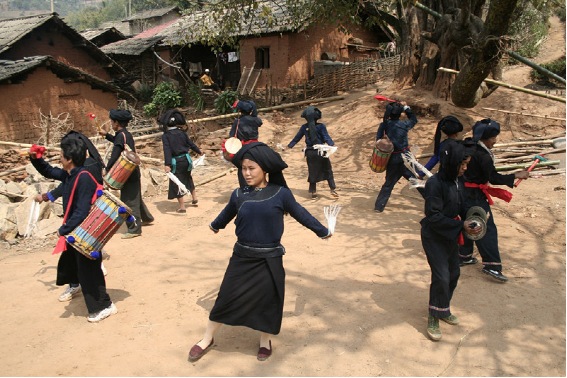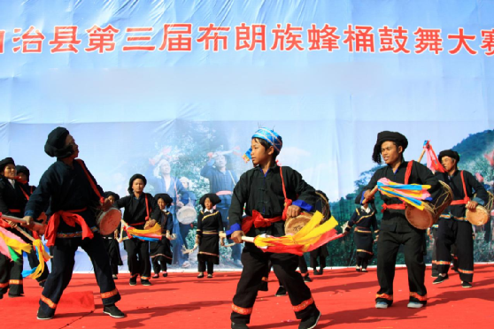 蜂桶鼓舞是布朗族的群眾性舞蹈,分為三步和五步兩種。演出時(shí),由兩名年輕男女雙手各持一條“帕節(jié)”(即毛巾)在前面跳“帕節(jié)舞”引導(dǎo),舞蹈動(dòng)作主要是甩手巾。其后是蜂桶鼓隊(duì),一般為4—6只,后緊隨2只象腳鼓,之后是6人敲打的大、中、小芒和镲,最后是跟著跳舞的人們和助興的老幼。蜂桶鼓舞的節(jié)奏明快熱烈,幾種打擊樂(lè)器相配合,“嘣咚、嘣咚……嘭嚓、嘭嚓……鏘切、鏘切……”,高、中、低音融為一體,獨(dú)具情趣。動(dòng)作大方、瀟灑、粗獷、活潑;舞姿輕盈、柔和、細(xì)膩。大南直布朗蜂桶鼓隊(duì)多次被邀赴省城和省外演出,向人們展示了本民族獨(dú)特的文化藝術(shù)風(fēng)采。