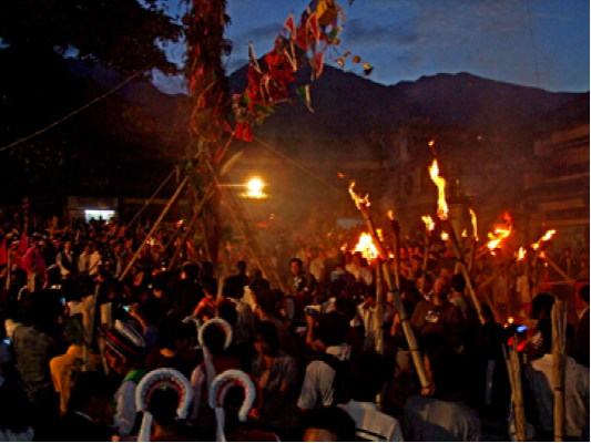 白族視火為生命與靈魂的護佑物,古有火崇拜習俗,火把節(jié)是白族對“生之禮贊和死之緬懷的節(jié)日”?;鸢压?jié)這一天,各村由年內新添子嗣之家作“會首”,在場壩中豎一高大的火把,常年扎十二臺,潤年扎十三臺,頂端扎升斗旗幟,上書“風調雨順”、“五谷豐登”字樣,下懸花紅、梨子、銅錢等物。天擦黑點燃火把,會首們以糖果、炒蠶豆、煙、茶、酒招待相聚在場壩中的老小。兒童則一手持小火炬,一手往火炬上撥灑松脂粉沐相戲,對新生的嬰兒表示致賀禮贊。與此同日,新亡故者之家人須上墳祭祀,在新故者墳前或大門口豎一小火把,如是者三年,表示對死者的緬懷,與史書“星回日祭祖”的記載相合。