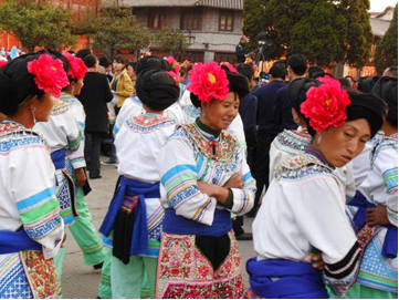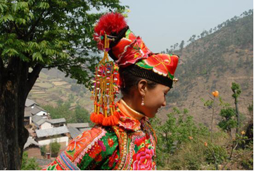 云南巍山彝族回族自治縣各民族如壯麗的織錦,將生活裝扮得五彩繽紛,充滿詩情畫意。其中特別是東山一帶的彝族服飾色彩較為豐富,款式變化多姿,并且以大量的銀制品和刺繡裝飾,制作工藝之精良,堪稱少數(shù)民族服飾一絕。以小孩帽而言,就有魚尾帽、小瓢帽、銀鼓帽、花帽和搭耳帽等數(shù)十種,名目繁多,式樣各異。帽子上都繡有花草、樹葉、龍鳳圖案,鑲嵌著閃亮的銀首飾,十分逗人喜愛。小孩的衣服式樣也很多,大多由紅、藍(lán)、綠、白幾種顏色的布料縫制而成,紅綠交織,藍(lán)白相襯,非常艷麗。如花朵一般的彝族少女通常頭戴銀鼓帽,墜耳環(huán)、身穿藍(lán)領(lǐng)褂,腰系花圍裙,下著綠彩褲,背掛圓裹背。銀鼓帽和繡花鞋做工極為精巧,全套裝飾花團(tuán)錦簇,恰似一只開屏的孔雀。結(jié)婚后的婦女就不再戴帽子,改為結(jié)發(fā)髻,裹包頭。發(fā)髻一般呈寶塔狀,外裹黑紗和黑布包頭,發(fā)髻上戴“別子”?!皠e子”其實(shí)就是發(fā)卡,均為銀制品,分為四串,每串有兩個(gè)燈籠繡球,兩個(gè)響鈴和兩尾小魚。包頭巾外再用銀串珠、亮球飾之。上衣著右衽大襟,前短后長、領(lǐng)、袖及襟邊則鑲以多層不同的金銀絲瓣或自繡花紋的多層寬窄不同的花邊。外罩齊腰藍(lán)布短領(lǐng)褂,領(lǐng)口上安裝著七個(gè)用銀鼓釘湊成五個(gè)葉子,狀如葵花形,彝語叫“披巴”的裝飾。領(lǐng)褂四周皆用銀鼓釘鑲邊,共四排,每排36顆。一件領(lǐng)褂上需有兩百多顆銀鼓釘,加上胸前佩戴銀制的“三須”針筒,“菱角吊”串珠和雞心型繡花荷包,整個(gè)裝飾真是銀裝素裹,分外嬌嬈。腰間系的圍腰布上,鑲嵌多層金銀絲瓣或自繡圖案的花邊。圖案有串枝蓮、牡丹花、太陽花及鳳戲牡丹、丹鳳朝陽等。無論未婚和已婚婦女,背上都有一個(gè)用羊毛搟制而成的圓型繡花裹背,直徑約一尺不等,內(nèi)外兩層,中可承物,上繡兩對(duì)太陽花,一大一小,對(duì)稱排列。裹背除用作裝飾外,還可保護(hù)腰部,既有欣賞價(jià)值,又有實(shí)用價(jià)值,這在巍山彝族服飾中是最為典型的一件飾物。銀鼓帽繡有42朵小花,鑲有96顆銀鼓釘,帽頂插有花一朵或釘有櫻花一束。其帽形如金魚,魚頭魚身為帽,魚尾多岔分為護(hù)頸,亦稱為“魚尾帽”。繡花鞋呈船形或鳳頭形,鞋面繡有40余朵小花,紅色中夾有40余片綠葉。如果是新娘鞋,則用紅色或粉色的軟鍛做鞋面,更為講究。