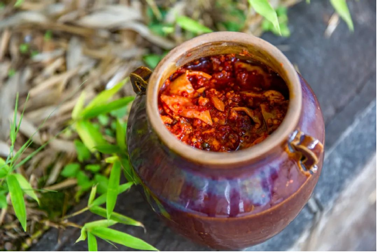 關于鶴慶的滋味,最深刻的記憶還要數那一小碟紅亮鮮香的豬肝胙。豬肝胙是用新鮮的內臟、排骨佐以食鹽、花椒、辣椒、八角、草果等眾多香辛料研制而成的鶴慶特色美食。腌制好的豬肝胙,開壇即可聞到濃重的香氣撲鼻而來,蒸熟下飯,炒菜提鮮,豬肝胙濃郁的滋味都不會令人失望。