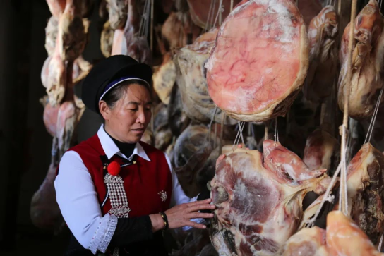 鶴慶火腿的美名,在滇西廣為傳頌。鶴慶火腿,又稱“圓腿”或是“盤腿”,取自其圓整的外形。制作鶴慶火腿,要精選皮薄肉嫩的后腿,經過晾透、扎孔、噴酒、撒鹽,反復的摩擦之后,腌制陰干,鶴慶火腿滋味鮮美,咸香不膩,蒸制,煸炒,亦或是加在其他菜肴中增香提味,都是上佳選擇。