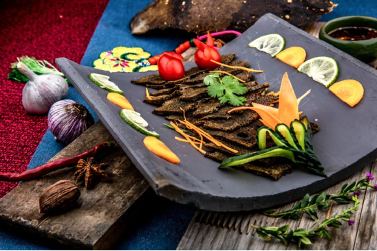 若論獨特,鶴慶吹肝不管是在視覺還是味覺上,都是與眾不同的存在。新鮮豬肝,要吹到鼓起膨脹之后,把事先準備好的辣椒面、花椒面、切細的香蔥,和酒一起往豬肝氣孔通道里填塞,在外面涂上一些精鹽,最后掛在屋檐下,經過時間的歷練方可成型。切成薄片的吹肝,細密的氣孔能夠迅速吸滿蘸汁的風味,獨特的口感可謂一絕。