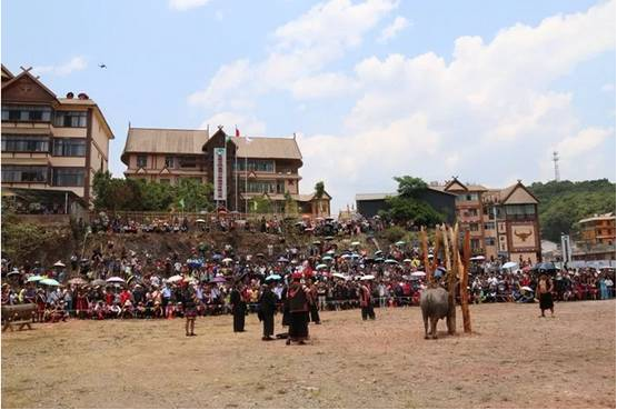 剽牛是佤族祈求神靈保佑,人們安居樂業(yè)、吉祥如意、幸福安康的一種傳統(tǒng)祭祀活動(dòng),同時(shí)他們也認(rèn)為這是與神靈鬼魂溝通的最有效方式?!柏狻弊殖浞煮w現(xiàn)了剽悍、敏捷而勇猛的含義?,F(xiàn)在剽牛樁上已經(jīng)拴好了要舉行剽牛祭祀的水牛,各鄉(xiāng)鎮(zhèn)群眾已經(jīng)陸續(xù)就位,讓我們一起去領(lǐng)略佤族狂野的剽牛祭祀吧!