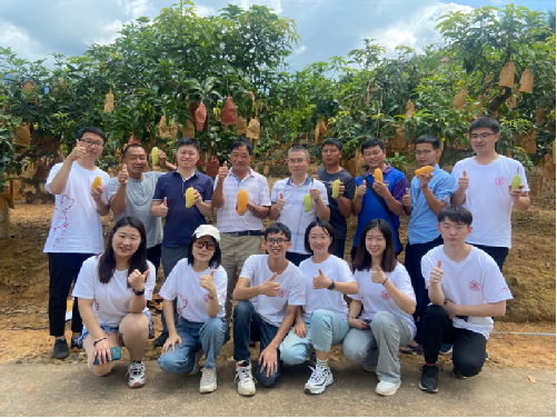 一是恩樂鎮(zhèn)復(fù)興村晚熟芒果基地調(diào)研。9月3日上午實踐團前往恩樂鎮(zhèn)復(fù)興村晚熟芒果基地考察,了解該基地的主要栽培品種,提出當(dāng)?shù)孛⒐耘嗟膬?yōu)勢及目前亟需解決的問題,并為農(nóng)戶進行相關(guān)栽培技術(shù)的講解,為當(dāng)?shù)赝硎烀⒐毣芾硖峁┘夹g(shù)支撐。同時實踐團選取不同海拔生長旺盛、豐產(chǎn)、穩(wěn)產(chǎn)的成年樹,隨機采摘果形均勻、健康飽滿、無機械損傷和病蟲害的成熟果,以及套上不同果袋子的果實,如白袋、紅袋和黃袋,所有樣品采摘后立即送回實驗室,對其單果重,果實縱徑、橫徑、厚度、總可溶性固形物、果形指數(shù)及風(fēng)味等綜合性狀進行測定,探究不同海拔和果袋對芒果果實品質(zhì)的影響,以期為生產(chǎn)實踐提供理論指導(dǎo),提高果實品質(zhì)。