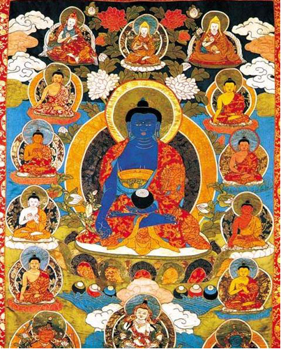 堆銹是青海塔爾寺獨(dú)創(chuàng)的一種藏族繪畫藝術(shù)形式,屬唐卡中的“國唐”。其制作特點(diǎn)是用各色質(zhì)地不同的綢緞綾羅剪出人物形狀和各種圖案形狀,然后在形象或圖案背后充塞羊毛、棉花等物,再逐一繡在黑色底子的大幅布幔上,使畫面產(chǎn)生出豐富而生動(dòng)的立體感和織物特有的肌理感,具有淺浮雕式的藝術(shù)效果。