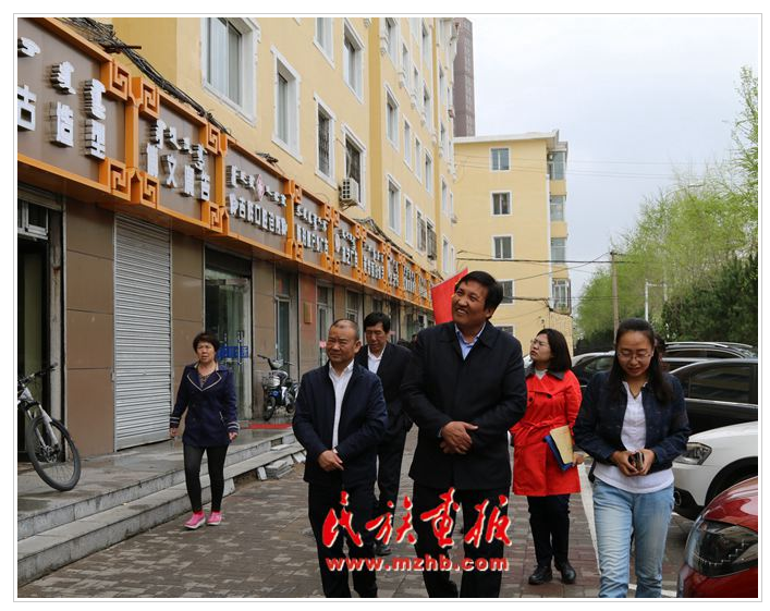 2017年5月3至4日,內(nèi)蒙古自治區(qū)民委副主任薩楚日勒圖(前左二)、語文處處長曹雙喜(前左一)檢查呼和浩特市的蒙漢雙語牌匾情況(民族畫報(bào)資料)