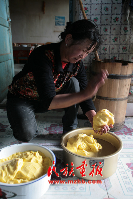 經(jīng)過反復(fù)搗動(dòng)、分離而制成酥油,并將其保存在牦牛胃制成的口袋里