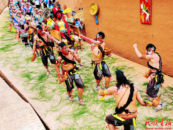 恭請大啞巴的儀式上,羅支全部到齊。羅支就是眾老啞巴,為首的被稱為畢摩。彩繪時,以不同的圖案分別繪在臉部的右上方作為家族和輩分區(qū)別。儀式上,六位畢摩在護衛(wèi)總管的護衛(wèi)下,依次點香叩首。畢摩大聲喊“請啞巴出山嘍”。然后四個壯實的中啞巴用扎好的彩轎抬著大啞巴游街,其余啞巴打歌跟在后面。最為活躍的是畢摩的跟幫,也稱為“馬彷”,他們以倒退的方式,邊跳邊引導行進的隊伍。啞巴隊從村頭到村尾,通過祭拜龍樹、祭鼓,經過“三請三唱三起號”,將大啞巴請到廣場,隨后開始了具有濃厚文化底蘊的啞巴舞表演。