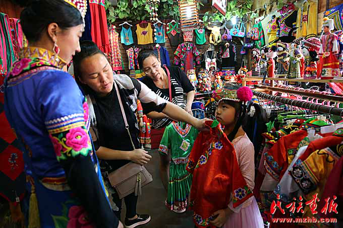 幫顧客挑選民族服飾的同時向顧客介紹民族文化