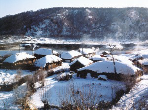 朝鮮族聚居的長(zhǎng)白山區(qū),山巒起伏,河流縱橫,村落都是背山面水,房屋坐北朝南。村落的大小主要是依開(kāi)墾耕地的多少而建,街道依山勢(shì)自然形成,東西方向較長(zhǎng),村屯之間以稻田相連。