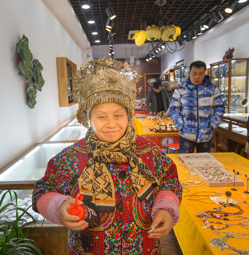 楊玉芬初到西安,是2008年來參加西部洽談會(huì)。那一次,她的苗族銀飾一天里賣了幾萬元,讓她十分驚喜。洽談會(huì)一結(jié)束,她一出來就直接打的,上去就問司機(jī)你們西安哪里最熱鬧?。克緳C(jī)說當(dāng)然是回民街啦!她便讓司機(jī)帶著直奔回民街,下了車,就地找了個(gè)攤位就擺起貨來。沒想到兩個(gè)小時(shí)就賣了3000多元。在西安生意這么好做?。钣穹耶?dāng)即決定不走了,鐵下心留在回民街。當(dāng)初,在滿是小吃的回民街上突然出現(xiàn)這么一個(gè)穿著苗服的女子忙來忙去賣銀飾,的確顯得很扎眼。但楊玉芬不把自己當(dāng)外人,很快融入了回民街,生意如同芝麻開花節(jié)節(jié)高,賣的品種越來越多,掙的錢也越來越多。她的攤位從小到大,從街邊升到室內(nèi)。去年,楊玉芬干脆在離回民街入口很近的黃金地段租了一間幾十平米的大店鋪,徹底結(jié)束“練攤”的日子,名正言順開起了“苗奶奶”銀飾店。有著上千種精美銀飾的“苗奶奶”,今天已成為坊上的一道風(fēng)景。