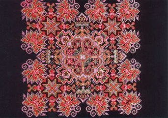 侗族刺繡工藝流行于湘、桂、黔三省交界處的侗族聚居區(qū)。圖案紋樣多取材于自然景物,如花、鳥(niǎo)、魚(yú)、蟲(chóng)之類(lèi)。畫(huà)面生動(dòng)活潑,色彩明麗。
