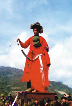 “跳五臺(tái)”可算是儀式中較為引人注目的。在村邊的一塊場(chǎng)地中央搭好一座約兩米高的木臺(tái),叫做“五臺(tái)”。受戒的弟子們同樣帶著草帽,身穿紅袍,由師父帶領(lǐng)走向五臺(tái)。在鑼鼓聲中,繞五臺(tái)三圈,繞畢盤腿坐好。師傅叫到誰(shuí),誰(shuí)就起來(lái),在師父的指引下,沿木梯爬上高臺(tái)。蹲在五臺(tái)上的受戒者,雙手十指交錯(cuò),小心翼翼地向后移動(dòng)到桌邊,然后翻落于藤網(wǎng)之中,由網(wǎng)中的棉被將受戒者包住。師父掀開棉被,見受戒者十指仍然穩(wěn)扣,坐像端端正正,表示度戒成功。十幾位弟子輪番上臺(tái),每位都順利通過(guò)。受戒弟子的父母和鄉(xiāng)親們都為他們的成功而歡喜。
